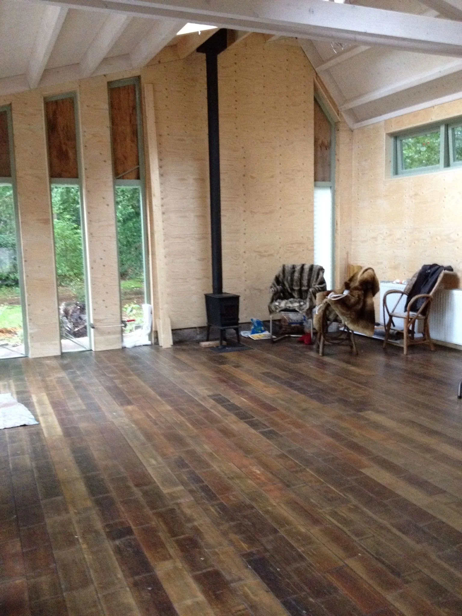 Else wist niet alleen wat ze wilde, maar ook hoe ze het wilde. En ze wilde per se zélf meewerken. De eerste tekening dateert van juli 2013; daarna kwamen de sloop- en bouwvergunningen. En de uitwerking begint in februari 2014. Eerst bouwde Daniel het fundament, goot het beton en bouwde het skelet. En daarna kon Else meewerken. Specialistische werkzaamheden werden door lokale vakmensen uitgevoerd. “Niet alleen het onderhoud en eventuele reparaties, achteraf,” was het standpunt van Else. Zo kwamen de grondwerker en de loodgieter uit het dorp. Bijna alles in het huisje is met de hand gemaakt: deuren, kozijnen, ramen, kasten. Zodra de ramen erin zaten, sliep ze 12 juli voor het eerst in haar nieuwe huisje, op het kale beton. Eind juli kwam het sedumdak er op en legden ze de bamboevloer.